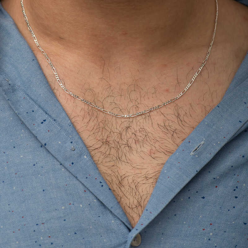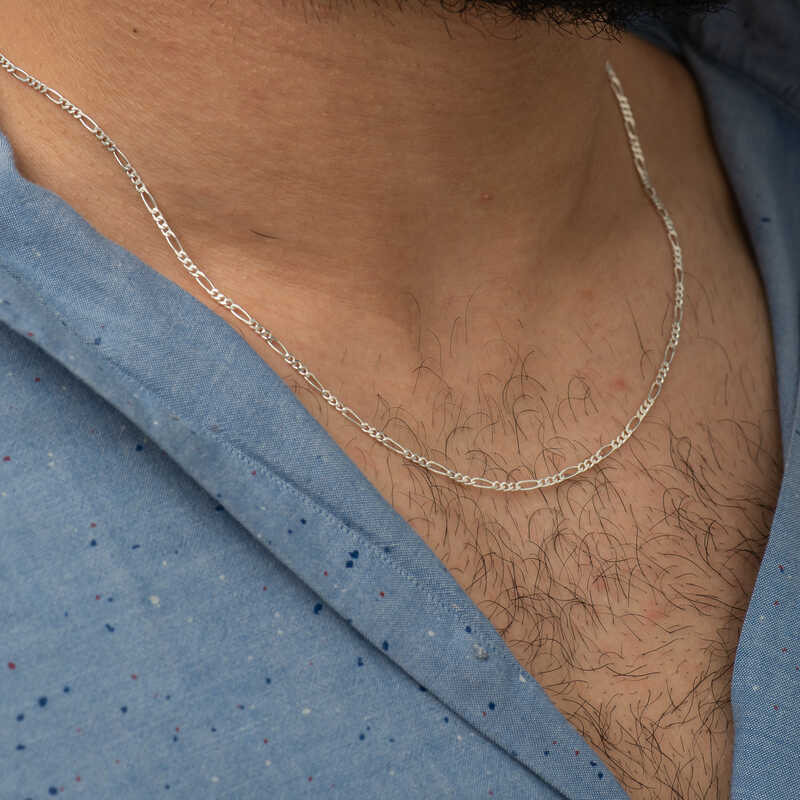 Gümüş zincir modelleri, gümüş takılar içerisinde hiç kuşkusuz en çok tercih edilen ürün gruplarından birisidir. Hem boyunları, hem de bilekleri süsler. İster kolye uçları ile birlikte, isterseniz de sade zincir şeklinde kullanabilirsiniz. Bu klasik figaro zincir modeli 925 ayar gümüşten imal edilmiştir. Makinelerde metre şeklinde üretilip daha sonra el emeği ile kolye haline getirilmektedir. Gümüş üzerine parlaklığı uzun süre koruması için  ayrıca gümüş kaplama da yapılmıştır. Gümüş figaro zincir modellerini hem erkekler hem kadınlar rahatlıkla kullanabilir. Tüm gümüş zincir modellerinde olduğu gibi 925 ayar gümüş figaro zincir modeli de el emeği ile üretildiği için belirtilen ortalama ürün ağırlığında ± %10 oynama olabilir.