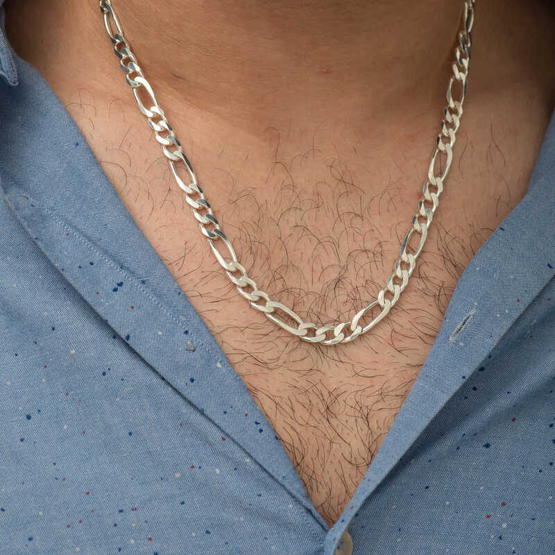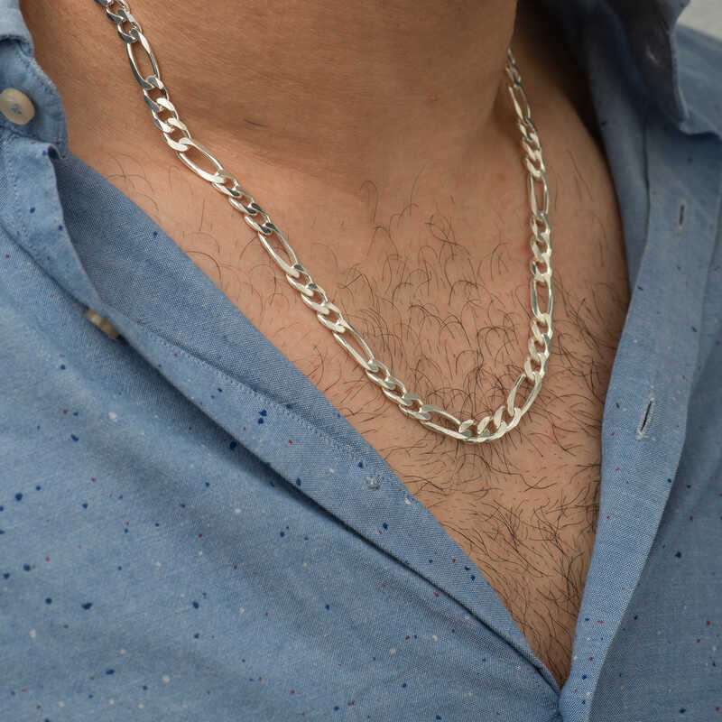 Gümüş zincir modelleri, gümüş takılar içerisinde hiç kuşkusuz en çok tercih edilen ürün gruplarından birisidir. Hem boyunları, hem de bilekleri süsler. İster kolye uçları ile birlikte, isterseniz de sade zincir şeklinde kullanabilirsiniz. Bu klasik figaro zincir modeli 925 ayar gümüşten imal edilmiştir. Makinelerde metre şeklinde üretilip daha sonra el emeği ile kolye haline getirilmektedir. Gümüş üzerine parlaklığı uzun süre koruması için  ayrıca gümüş kaplama da yapılmıştır. Gümüş figaro zincir modellerini hem erkekler hem kadınlar rahatlıkla kullanabilir. Tüm gümüş zincir modellerinde olduğu gibi 925 ayar gümüş figaro zincir modeli de el emeği ile üretildiği için belirtilen ortalama ürün ağırlığında ± %10 oynama olabilir.