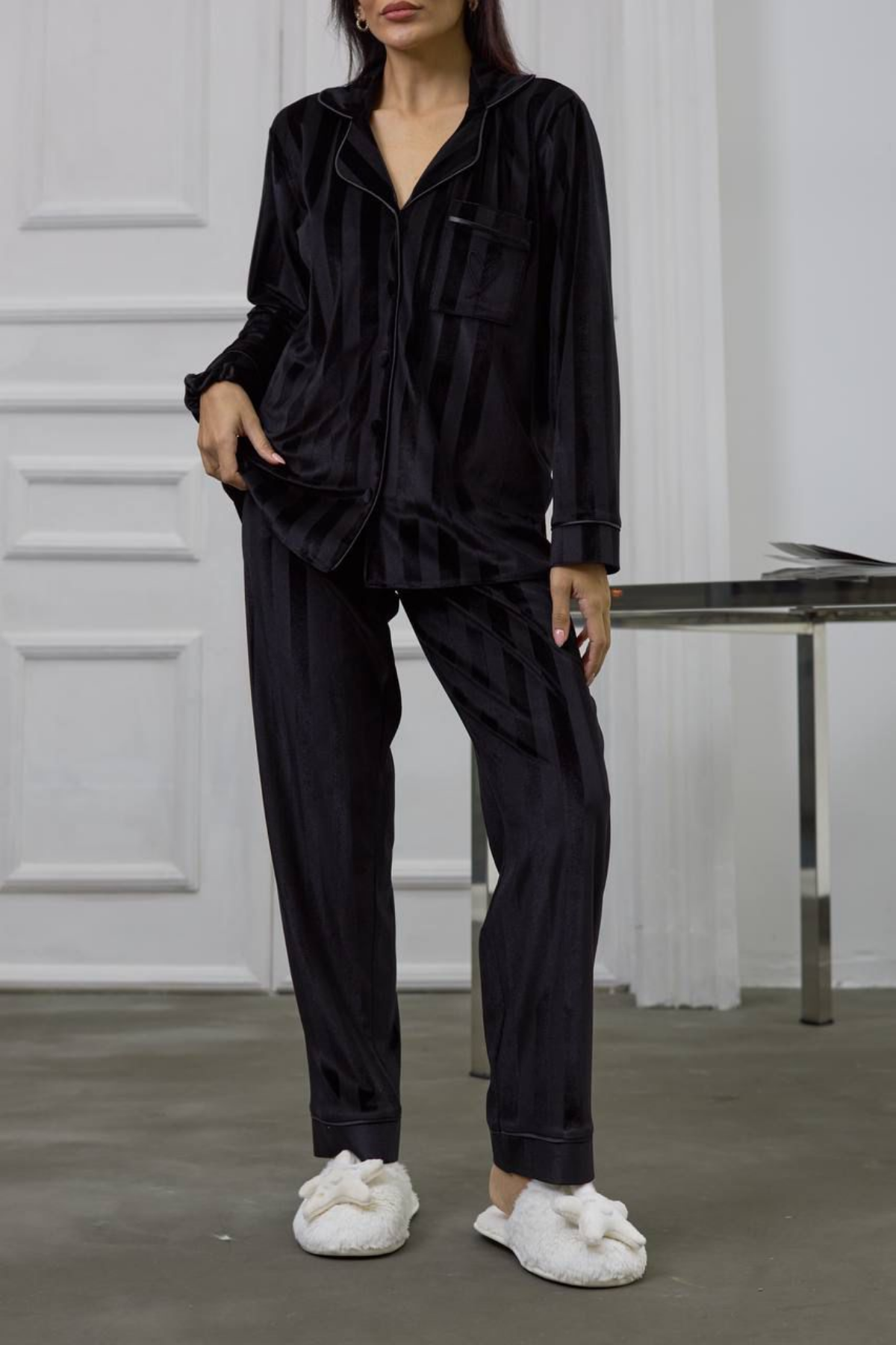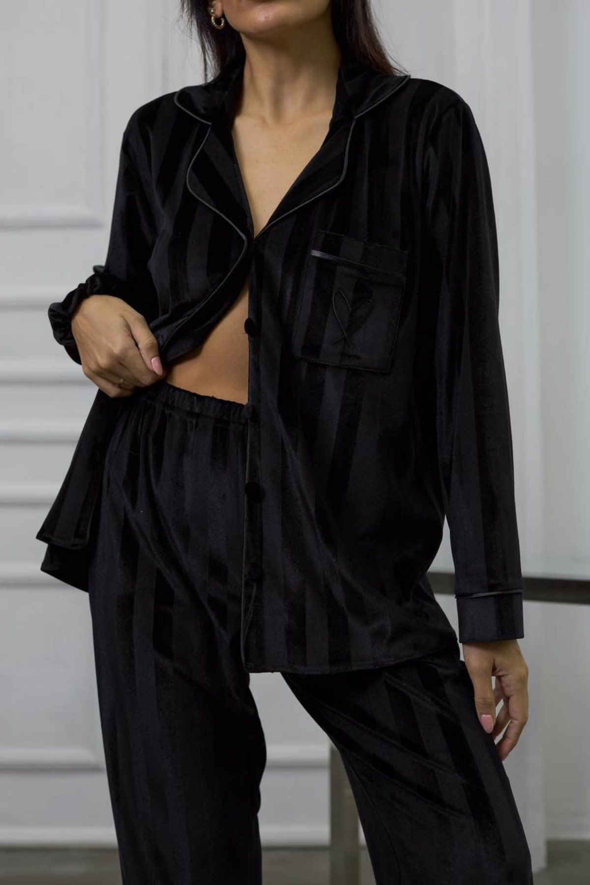 Gizotti Siyah Gofreli Kalp Nakışlı Uzun Kadife Pijama Takımı ile evinizde bir kraliçe gibi hissedeceksiniz.