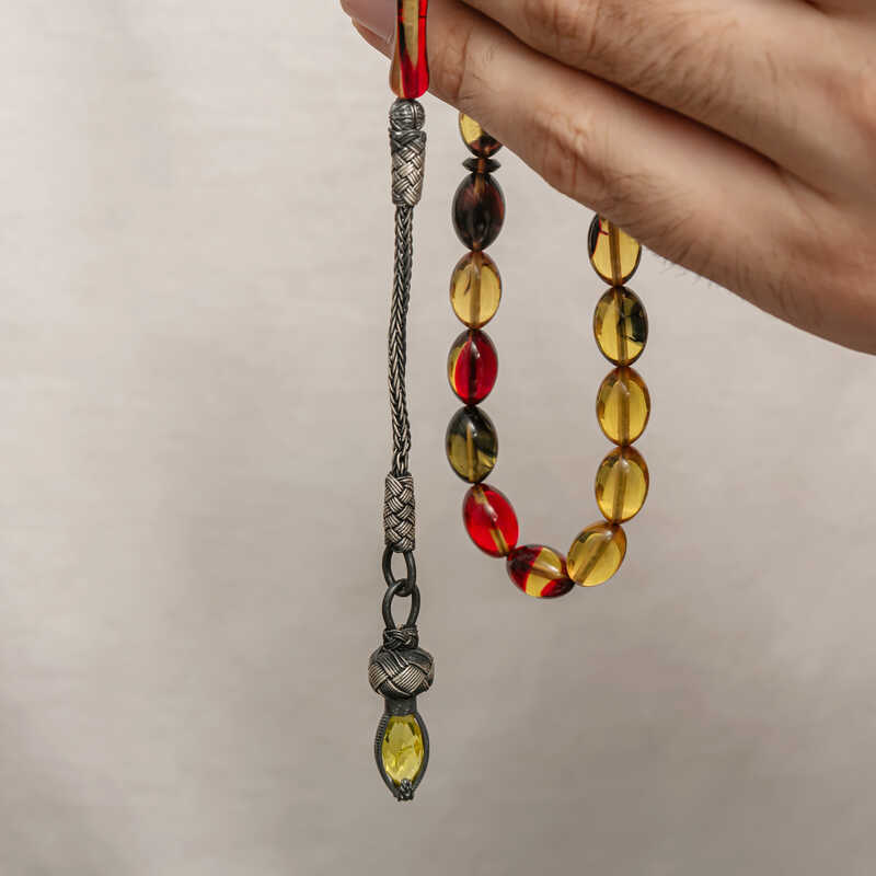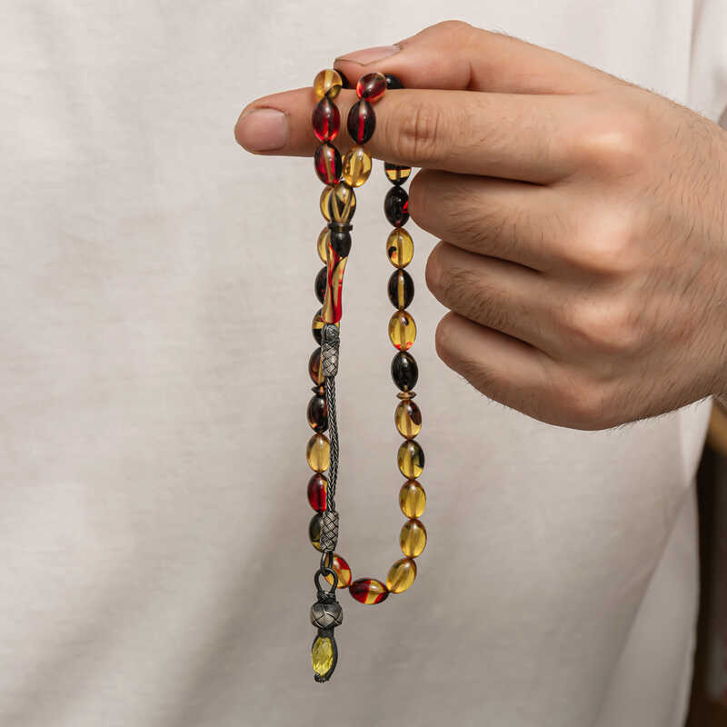 Kehribar, çam ağacı reçinesinin toprak altında uzun yıllar boyunca birikerek oluşan bir maddedir. Hemen hemen taş ile aynı sertliktedir fakat yoğunluğu düşüktür. Çam kokusu yayar. Oluşumu uzun zaman aldığından ve yapay olarak yapılamadığından değerli bir maddedir. Sıkma kehribar ise kehribar taşından farklı olarak onun özelliklerini taşıyan, görüntü itibariyle ona benzeyen fakat gerçek olmayan bir malzemedir. Ülkemizde ve dünyanın bir çok yerinde kehribar taşından çeşitli malzemeler üretilmiştir. Ülkemizde en yaygın olarak tesbih üretilmektedir. Kehribar tesbihler elde ısındıkça kehribar benzeri bir koku verir ve renk değiştirir. Bir çok rengi vardır. Hatta iki rengin birleşiminden oluşan kehribar tesbih modelleri de vardır. Genellikle gümüş püskül ile kullanılır veya sistemli olarak da kullanılabilir. Ülkemizin güzide tesbih ustaları bu malzemeyi sıklıkla işlemek suretiyle çeşitli sanat eserleri meydana getirirler. Bu tesbihler de koleksiyonerler tarafından alınıp satılmaktadır. Gümüş 1000 ayar kazaz püsküllü sıkma kehribar tesbih modeli de günlük hayatta kullanılabilecek çok şık bir tesbih çeşididir. Özel günlerin vazgeçilmez hediyesi sıkma kehribar tesbihler erkekler için doğum günü, sevgililer günü ve babalar günü gibi özel zamanlarda hediye olarak tercih edilebilir. Gümüş kazaz püsküllü sıkma kehribar tesbih modeli diğer kehribar tesbih modellerinde olduğu gibi tamamen el emeği ile imal edilmiştir.