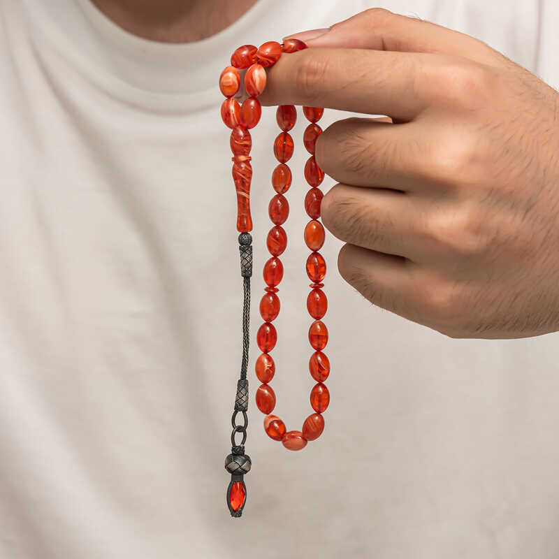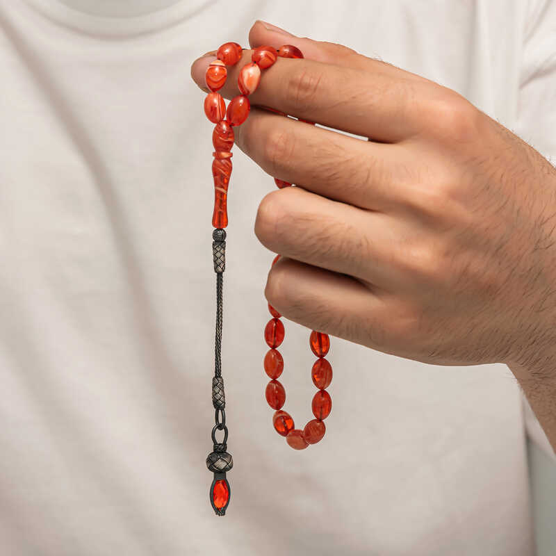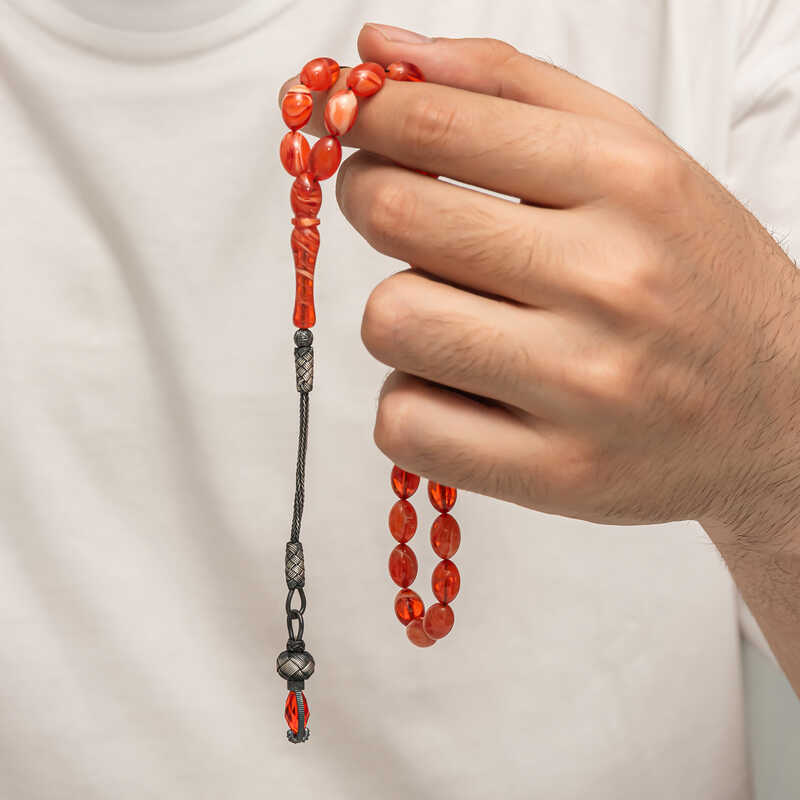 Kehribar, çam ağacı reçinesinin toprak altında uzun yıllar boyunca birikerek oluşan bir maddedir. Hemen hemen taş ile aynı sertliktedir fakat yoğunluğu düşüktür. Çam kokusu yayar. Oluşumu uzun zaman aldığından ve yapay olarak yapılamadığından değerli bir maddedir. Sıkma kehribar ise kehribar taşından farklı olarak onun özelliklerini taşıyan, görüntü itibariyle ona benzeyen fakat gerçek olmayan bir malzemedir. Ülkemizde ve dünyanın bir çok yerinde kehribar taşından çeşitli malzemeler üretilmiştir. Ülkemizde en yaygın olarak tesbih üretilmektedir. Kehribar tesbihler elde ısındıkça kehribar benzeri bir koku verir ve renk değiştirir. Bir çok rengi vardır. Hatta iki rengin birleşiminden oluşan kehribar tesbih modelleri de vardır. Genellikle gümüş püskül ile kullanılır veya sistemli olarak da kullanılabilir. Ülkemizin güzide tesbih ustaları bu malzemeyi sıklıkla işlemek suretiyle çeşitli sanat eserleri meydana getirirler. Bu tesbihler de koleksiyonerler tarafından alınıp satılmaktadır. Gümüş 1000 ayar kazaz püsküllü sıkma kehribar tesbih modeli de günlük hayatta kullanılabilecek çok şık bir tesbih çeşididir. Özel günlerin vazgeçilmez hediyesi sıkma kehribar tesbihler erkekler için doğum günü, sevgililer günü ve babalar günü gibi özel zamanlarda hediye olarak tercih edilebilir. Gümüş kazaz püsküllü sıkma kehribar tesbih modeli diğer kehribar tesbih modellerinde olduğu gibi tamamen el emeği ile imal edilmiştir.