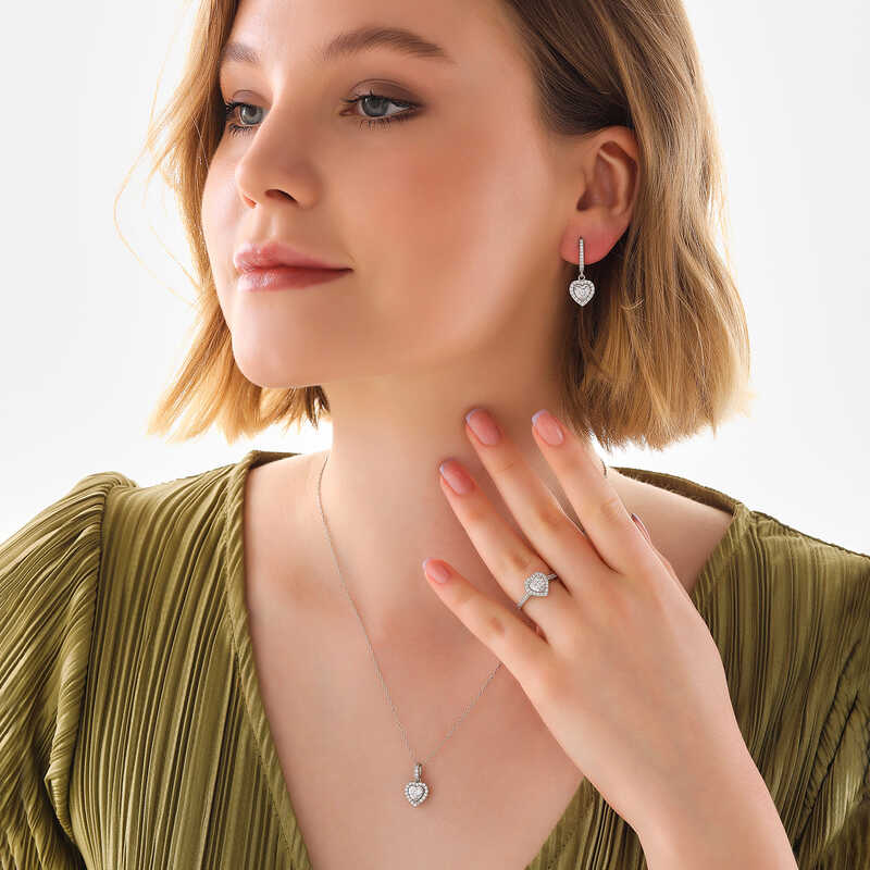 Gümüş Beyaz Taşlı Kalpli Kadın Set