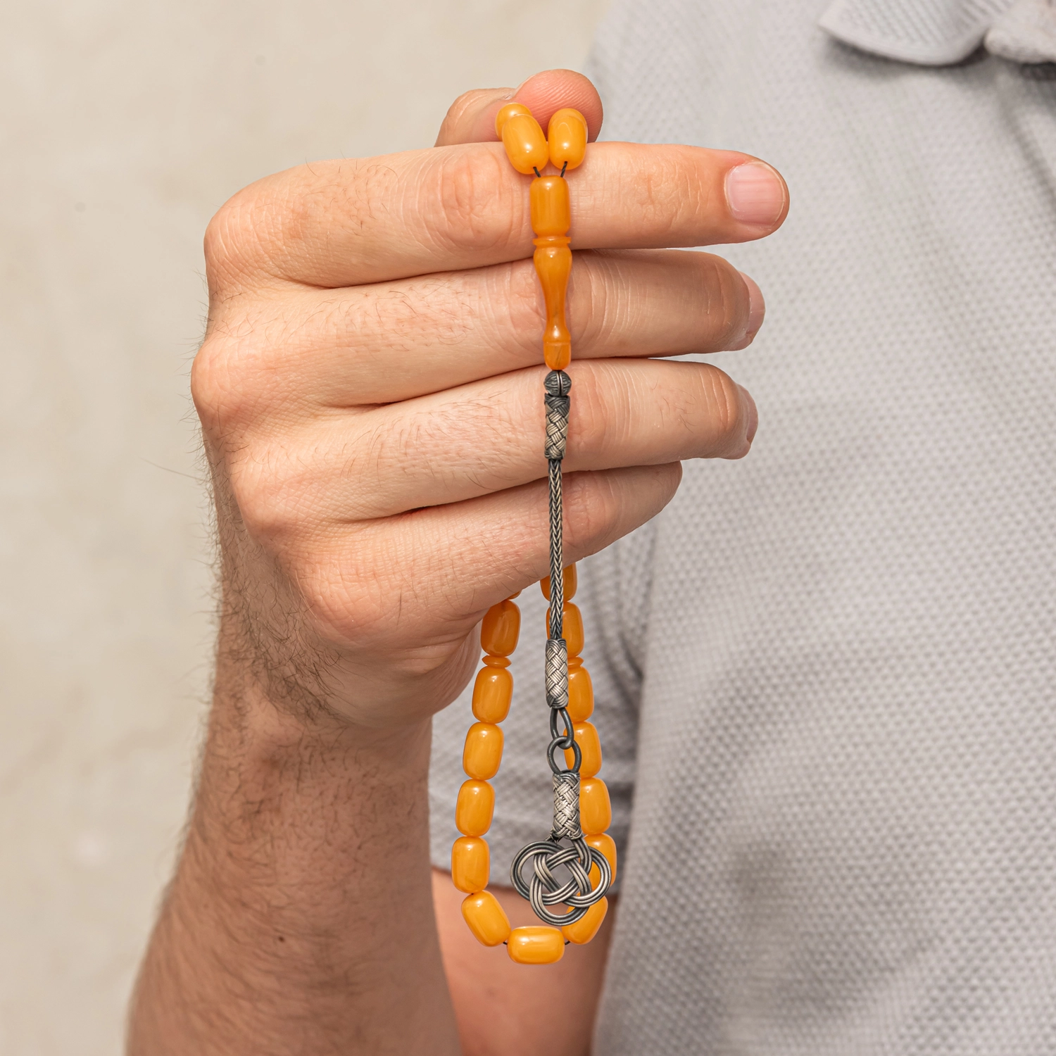 Gümüş Kazaz Püsküllü Kapsül Kesim Sarı Sıkma Kehribar Tesbih, geleneksel el işçiliğiyle üretilmiş, zarafet ve kaliteyi bir arada sunan özel bir aksesuardır. Canlı sarı rengiyle enerjik bir görünüm kazandıran tesbih, kapsül kesim formuyla elde rahat bir kullanım sağlar. Gümüş kazaz püskülü ise tesbihe estetik bir detay ve dayanıklılık katar. Günlük kullanımda, koleksiyonlarda ya da anlamlı bir hediye seçeneği olarak tercih edilebilecek bu tesbih, hem klasik hem de modern tarzlara uyum sağlar.Gümüş ve değerli taşlar nedeniyle belirtilen ürün ağırlığında ± %10 sapma olabilmektedir.