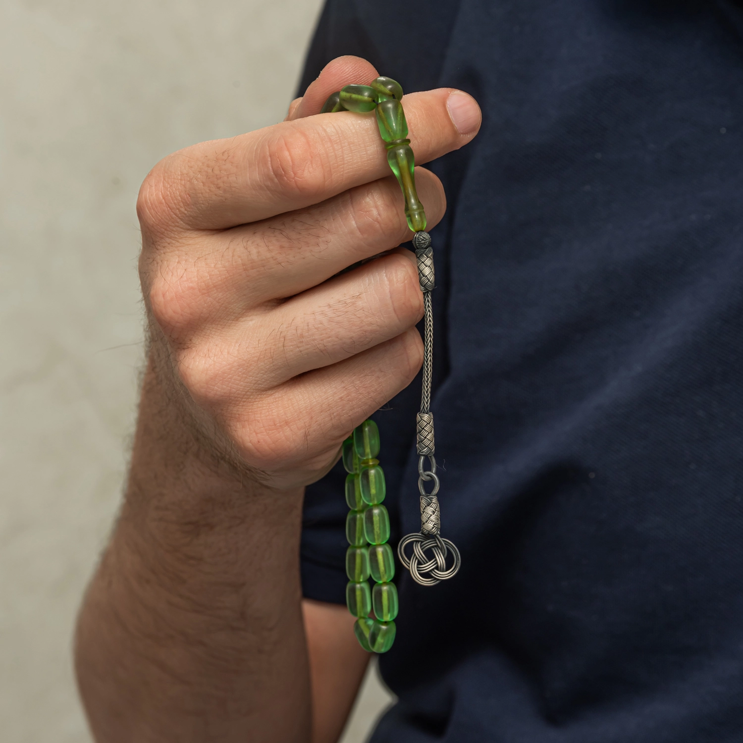 Gümüş Kazaz Püsküllü Kapsül Kesim Yeşil Sıkma Kehribar Tesbih, el işçiliği ile özenle hazırlanmış, estetik ve kaliteli bir aksesuardır. Canlı yeşil tonu, tesbihe ferah ve doğal bir görünüm kazandırırken, kapsül kesim boncuklar hem şık bir tasarım hem de elde rahat bir kullanım sağlar. Gümüş kazaz püskülü, tesbihe zarif bir detay ve dayanıklılık ekleyerek bütünlüğü tamamlar. Koleksiyonluk bir parça olarak veya anlamlı bir hediye seçeneği olarak ideal olan bu tesbih, klasik ve modern tarzlarla mükemmel uyum sağlar.Gümüş ve değerli taşlar nedeniyle belirtilen ürün ağırlığında ± %10 sapma olabilmektedir.