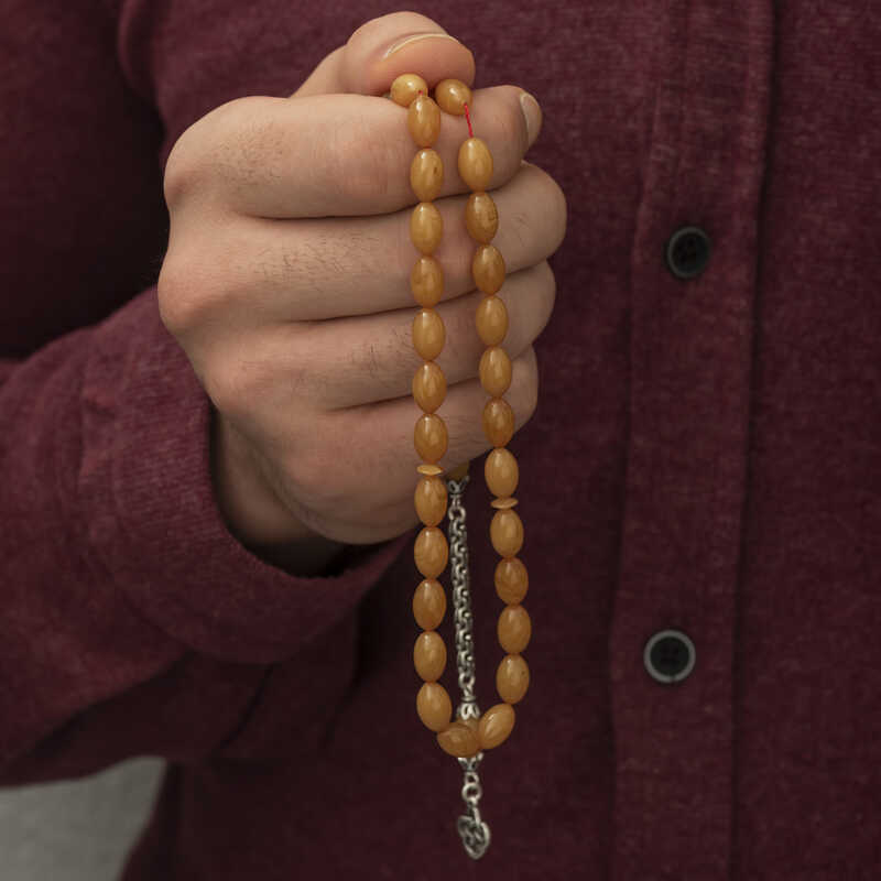 Kehribar, çam ağacı reçinesinin toprak altında uzun yıllar boyunca birikerek oluşan bir maddedir. Hemen hemen taş ile aynı sertliktedir fakat yoğunluğu düşüktür. Çam kokusu yayar. Oluşumu uzun zaman aldığından ve yapay olarak yapılamadığından değerli bir maddedir. Sıkma kehribar ise kehribar taşından farklı olarak onun özelliklerini taşıyan, görüntü itibariyle ona benzeyen fakat gerçek olmayan bir malzemedir. Ülkemizde ve dünyanın bir çok yerinde kehribar taşından çeşitli malzemeler üretilmiştir. Ülkemizde en yaygın olarak tesbih üretilmektedir. Kehribar tesbihler elde ısındıkça kehribar benzeri bir koku verir ve renk değiştirir. Bir çok rengi vardır. Hatta iki rengin birleşiminden oluşan kehribar tesbih modelleri de vardır. Genellikle gümüş püskül ile kullanılır veya sistemli olarak da kullanılabilir. Ülkemizin güzide tesbih ustaları bu malzemeyi sıklıkla işlemek suretiyle çeşitli sanat eserleri meydana getirirler. Bu tesbihler de koleksiyonerler tarafından alınıp satılmaktadır. Gümüş püsküllü arpa sıkma kehribar tesbih modeli de günlük hayatta kullanılabilecek çok şık bir tesbih çeşididir. Özel günlerin vazgeçilmez hediyesi sıkma kehribar tesbihler erkekler için doğum günü, sevgililer günü ve babalar günü gibi özel zamanlarda hediye olarak tercih edilebilir. Gümüş püsküllü arpa sıkma kehribar tesbih modeli diğer kehribar tesbih modellerinde olduğu gibi tamamen el emeği ile imal edilmiştir.