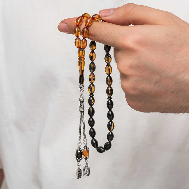 Kehribar, çam ağacı reçinesinin toprak altında uzun yıllar boyunca birikerek oluşan bir maddedir. Hemen hemen taş ile aynı sertliktedir fakat yoğunluğu düşüktür. Çam kokusu yayar. Oluşumu uzun zaman aldığından ve yapay olarak yapılamadığından değerli bir maddedir. Sıkma kehribar ise kehribar taşından farklı olarak onun özelliklerini taşıyan, görüntü itibariyle ona benzeyen fakat gerçek olmayan bir malzemedir. Ülkemizde ve dünyanın bir çok yerinde kehribar taşından çeşitli malzemeler üretilmiştir. Ülkemizde en yaygın olarak tesbih üretilmektedir. Kehribar tesbihler elde ısındıkça kehribar benzeri bir koku verir ve renk değiştirir. Bir çok rengi vardır. Hatta iki rengin birleşiminden oluşan kehribar tesbih modelleri de vardır. Genellikle gümüş püskül ile kullanılır veya sistemli olarak da kullanılabilir. Ülkemizin güzide tesbih ustaları bu malzemeyi sıklıkla işlemek suretiyle çeşitli sanat eserleri meydana getirirler. Bu tesbihler de koleksiyonerler tarafından alınıp satılmaktadır. Gümüş püsküllü sıkma kehribar tesbih modeli de günlük hayatta kullanılabilecek çok şık bir tesbih çeşididir. Özel günlerin vazgeçilmez hediyesi sıkma kehribar tesbihler erkekler için doğum günü, sevgililer günü ve babalar günü gibi özel zamanlarda hediye olarak tercih edilebilir. Gümüş püsküllü sıkma kehribar tesbih modeli diğer kehribar tesbih modellerinde olduğu gibi tamamen el emeği ile imal edilmiştir.