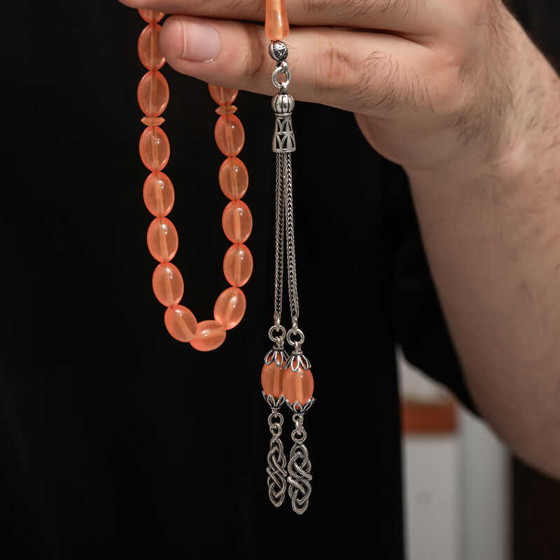 Kehribar, çam ağacı reçinesinin toprak altında uzun yıllar boyunca birikerek oluşan bir maddedir. Hemen hemen taş ile aynı sertliktedir fakat yoğunluğu düşüktür. Çam kokusu yayar. Oluşumu uzun zaman aldığından ve yapay olarak yapılamadığından değerli bir maddedir. Sıkma kehribar ise kehribar taşından farklı olarak onun özelliklerini taşıyan, görüntü itibariyle ona benzeyen fakat gerçek olmayan bir malzemedir. Ülkemizde ve dünyanın bir çok yerinde kehribar taşından çeşitli malzemeler üretilmiştir. Ülkemizde en yaygın olarak tesbih üretilmektedir. Kehribar tesbihler elde ısındıkça kehribar benzeri bir koku verir ve renk değiştirir. Bir çok rengi vardır. Hatta iki rengin birleşiminden oluşan kehribar tesbih modelleri de vardır. Genellikle gümüş püskül ile kullanılır veya sistemli olarak da kullanılabilir. Ülkemizin güzide tesbih ustaları bu malzemeyi sıklıkla işlemek suretiyle çeşitli sanat eserleri meydana getirirler. Bu tesbihler de koleksiyonerler tarafından alınıp satılmaktadır. Gümüş püsküllü sıkma kehribar tesbih modeli de günlük hayatta kullanılabilecek çok şık bir tesbih çeşididir. Özel günlerin vazgeçilmez hediyesi sıkma kehribar tesbihler erkekler için doğum günü, sevgililer günü ve babalar günü gibi özel zamanlarda hediye olarak tercih edilebilir. Gümüş püsküllü sıkma kehribar tesbih modeli diğer kehribar tesbih modellerinde olduğu gibi tamamen el emeği ile imal edilmiştir.