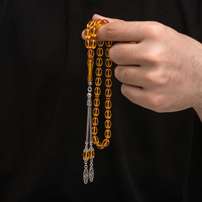 Kehribar, çam ağacı reçinesinin toprak altında uzun yıllar boyunca birikerek oluşan bir maddedir. Hemen hemen taş ile aynı sertliktedir fakat yoğunluğu düşüktür. Çam kokusu yayar. Oluşumu uzun zaman aldığından ve yapay olarak yapılamadığından değerli bir maddedir. Sıkma kehribar ise kehribar taşından farklı olarak onun özelliklerini taşıyan, görüntü itibariyle ona benzeyen fakat gerçek olmayan bir malzemedir. Ülkemizde ve dünyanın bir çok yerinde kehribar taşından çeşitli malzemeler üretilmiştir. Ülkemizde en yaygın olarak tesbih üretilmektedir. Kehribar tesbihler elde ısındıkça kehribar benzeri bir koku verir ve renk değiştirir. Bir çok rengi vardır. Hatta iki rengin birleşiminden oluşan kehribar tesbih modelleri de vardır. Genellikle gümüş püskül ile kullanılır veya sistemli olarak da kullanılabilir. Ülkemizin güzide tesbih ustaları bu malzemeyi sıklıkla işlemek suretiyle çeşitli sanat eserleri meydana getirirler. Bu tesbihler de koleksiyonerler tarafından alınıp satılmaktadır. Gümüş püsküllü sıkma kehribar tesbih modeli de günlük hayatta kullanılabilecek çok şık bir tesbih çeşididir. Özel günlerin vazgeçilmez hediyesi sıkma kehribar tesbihler erkekler için doğum günü, sevgililer günü ve babalar günü gibi özel zamanlarda hediye olarak tercih edilebilir. Gümüş püsküllü sıkma kehribar tesbih modeli diğer kehribar tesbih modellerinde olduğu gibi tamamen el emeği ile imal edilmiştir.