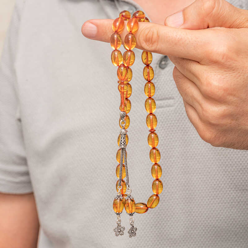 Gümüş püsküllü ateş kehribar tesbih,estetik ve manevi değerleri bir araya getiren şık bir takıdır.Bu tesbihde,sıcak ve parlak turuncu tonlarda,doğal kehribar taşlarından yapılmış büyük oval taneler bulunur.Taşların doğal ışık altında parıldayan ve şeffaflığıyla göz kamaştıran görünümü,ürünün öne çıkan özelliklerindendir.Sevdiklerinize anlamlı ve şık bir hediye arıyorsanız,bu özel tesbih mükemmel bir seçim olur.Sıkma kehribar tesbih modeli diğer kehribar tesbih modellerinde olduğu gibi tamamen el emeği ile imal edilmiştir.