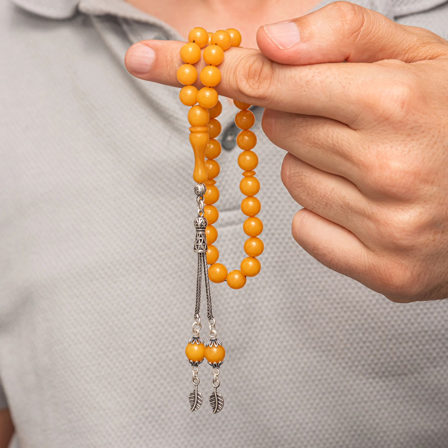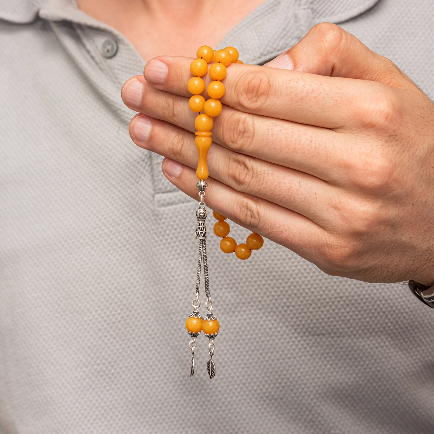 El işçiliğinin zarafetini yansıtan Gümüş Püsküllü Sarı Yuvarlak Sıkma Kehribar Tesbih, canlı sarı rengi ve yuvarlak taneleri ile dikkat çeken şık ve özel bir aksesuardır. Parlak tonlarıyla enerjiyi temsil eden kehribar taneleri, elde hoş bir ağırlık ve pürüzsüz bir his sunar.Gümüş püskül detayı, tesbihin estetik görünümünü tamamlayarak hem geleneksel hem de modern bir tarz oluşturur. Günlük kullanıma uygun olduğu gibi, koleksiyonlar için de değerli bir parça niteliğindedir.Hem manevi anlam taşıyan hem de stilinizi tamamlayan bu özel tesbih, sevdiklerinize hediye etmek için de mükemmel bir seçenektir. Şık, dayanıklı ve zarif yapısıyla uzun yıllar keyifle kullanabilirsiniz.Gümüş ve değerli taşlar nedeniyle belirtilen ürün ağırlığında ± %10 sapma olabilmektedir.